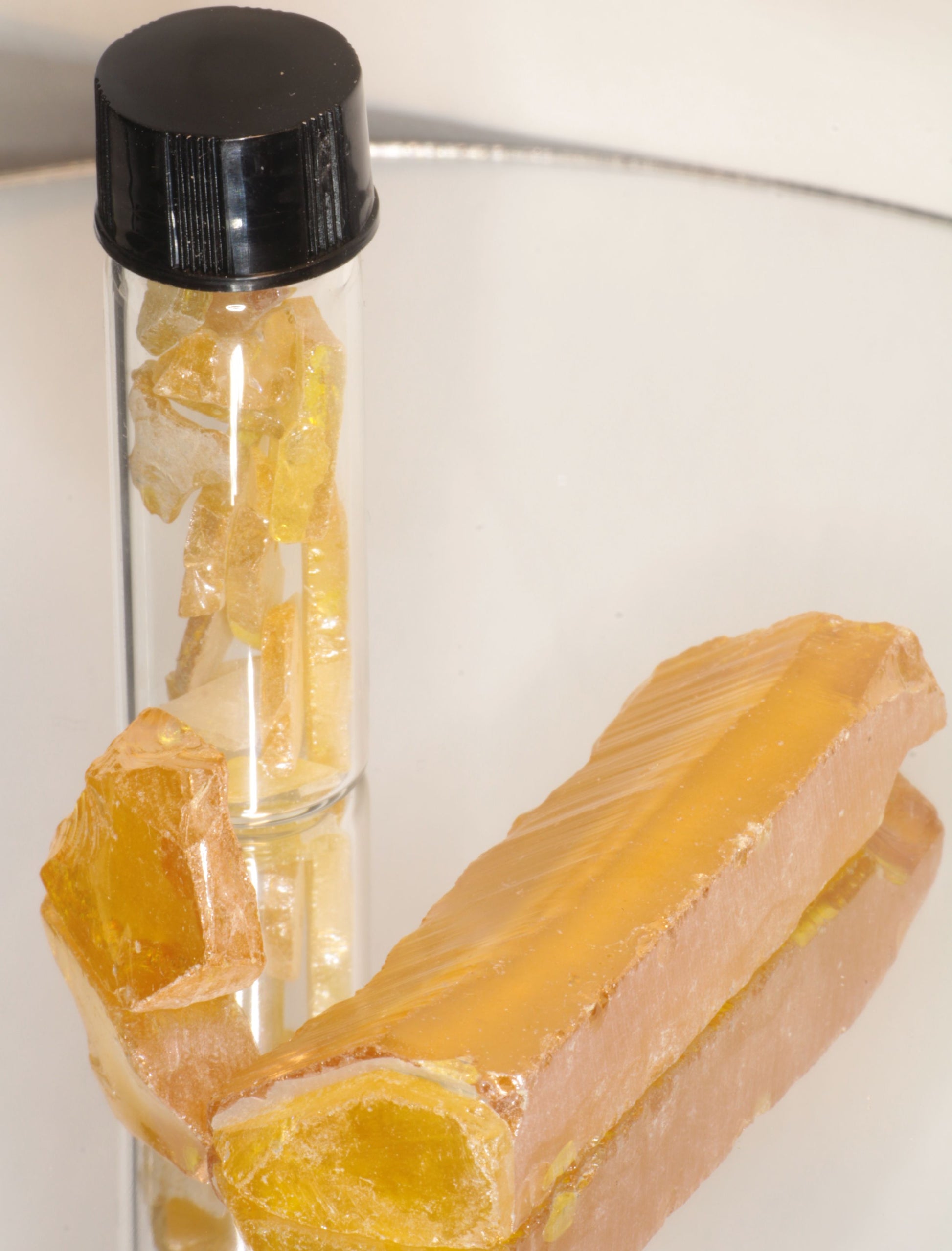 These are BGO-20 aka Bismuth Germanate specimens. Some are end cuts that show crystal faces while others have been sawn into flat plates in the process of making wafers for scientific use.