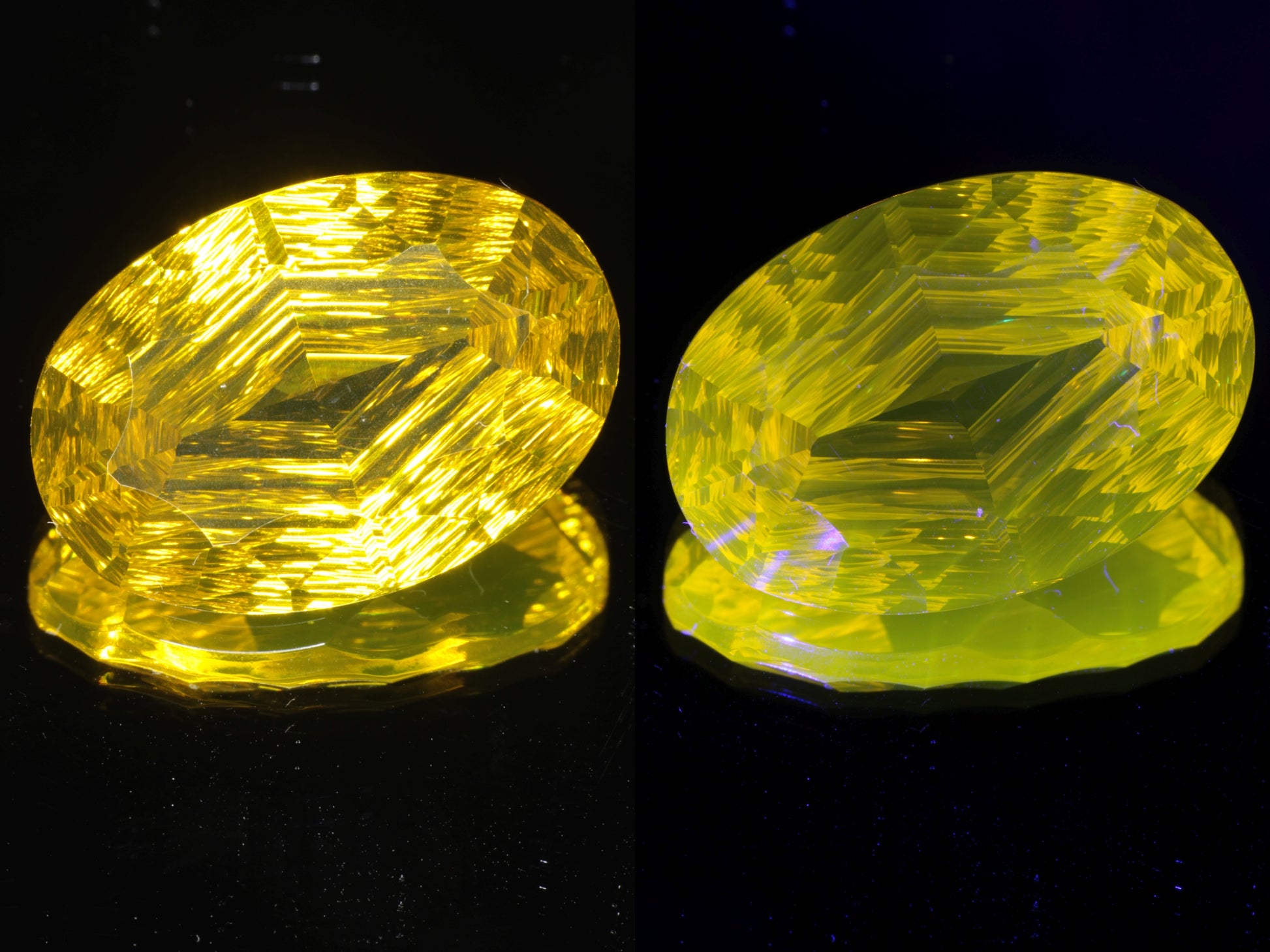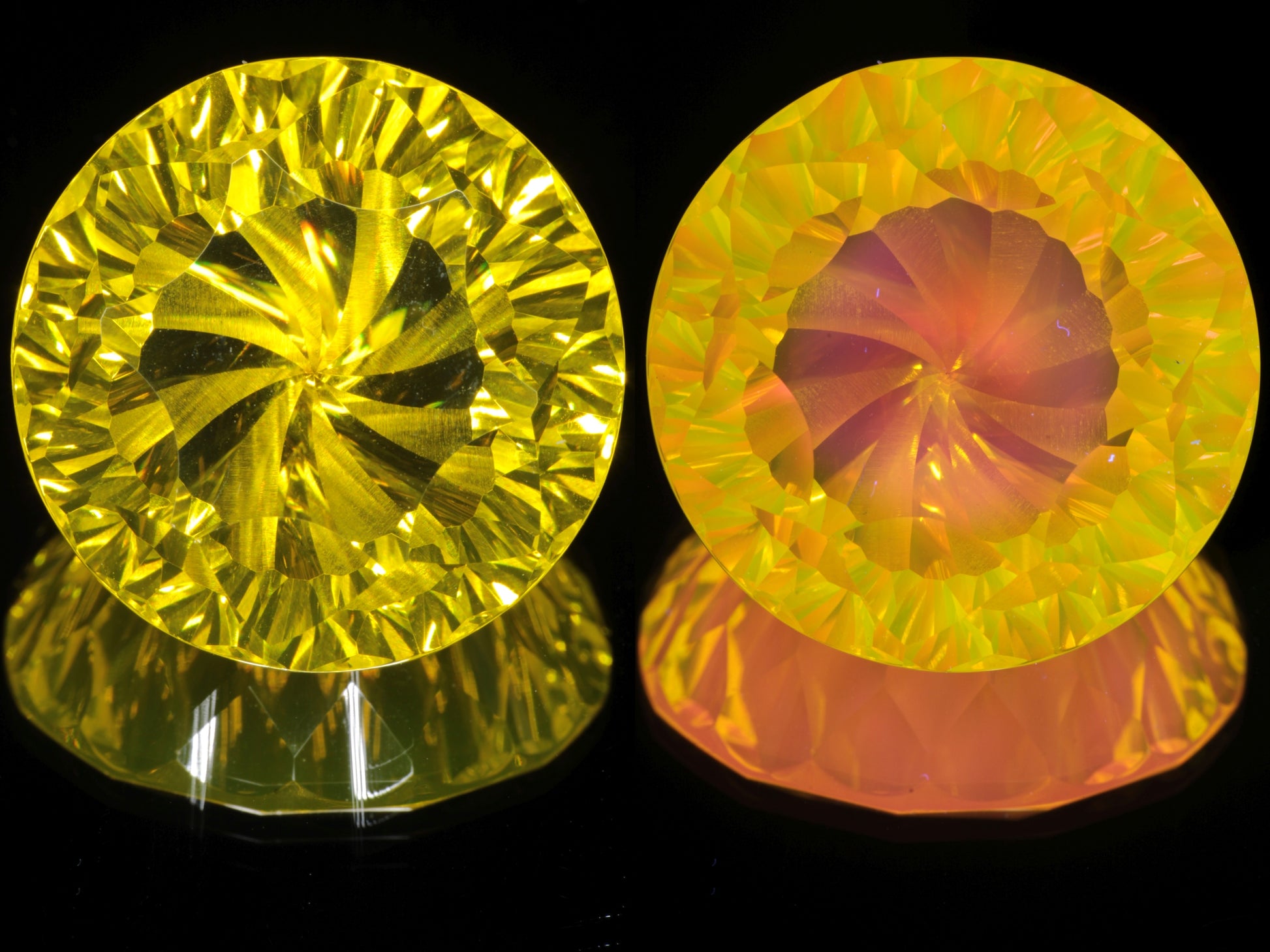 These are calibrated fantasy cut laser garnets (Nd+Ce:YAG) with concave facets. They come in violet and gold (depending on the ratio of Ce to Nd) and have variable fluorescence including yellow, pink, red and violet.