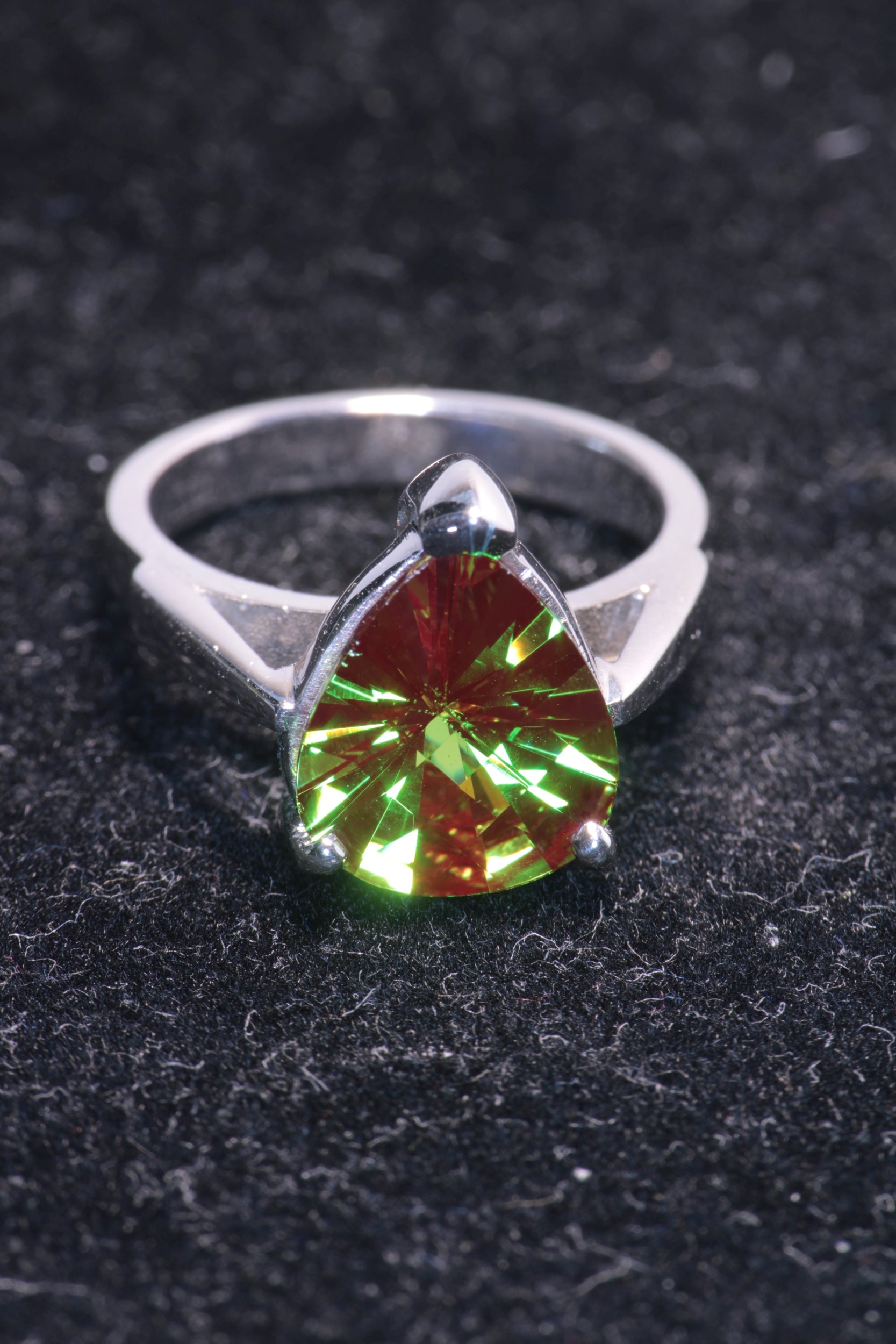 Cr:YAG, aka 'Christmas garnet' is an exotic lab-created garnet and a really unique gem even by our standards. It has a totally unique color, with a rich almost tsavorite green base and strong red fluorescence. This means that it shows a mixture of red and green flashes, and which color predominates depends on the lighting (color and angle) as well as the background it is set against. Lighter toned stones will look almost pure green when placed on a white background but change to a mix of red and green when put on a dark background. Note that the camera exaggerates the red at the expense of the green--they do look better in person. They look a bit like alexandrite or color change garnet but is also totally different and unique. This is easily one of my favorite gems, unlike anything else found in nature or any other synthetic.