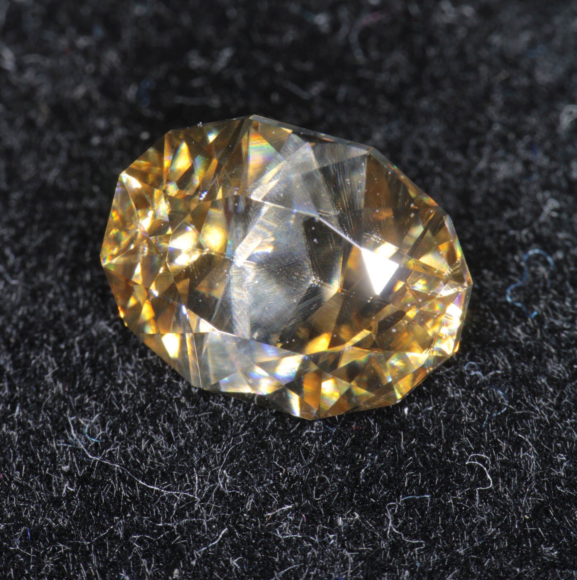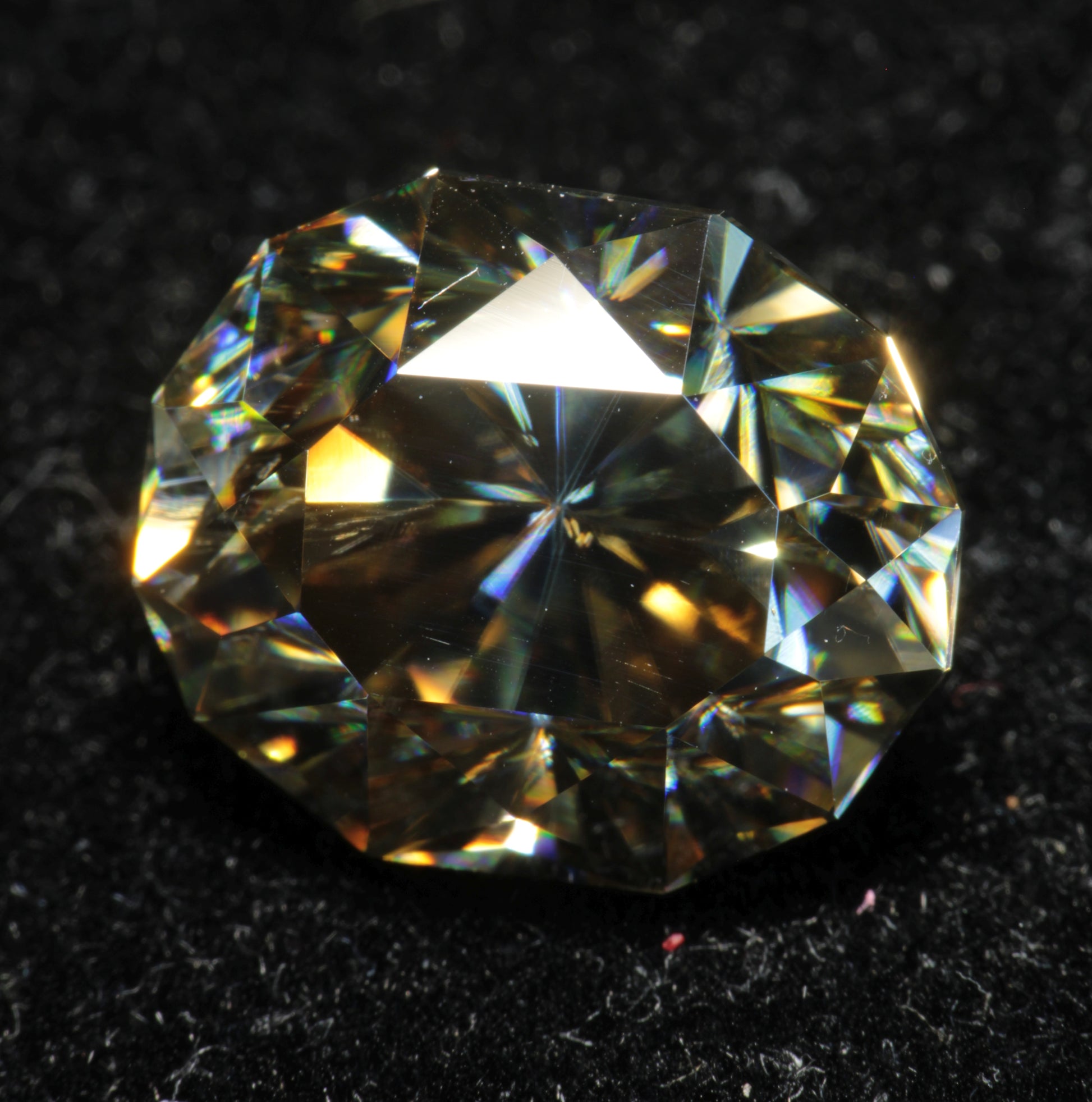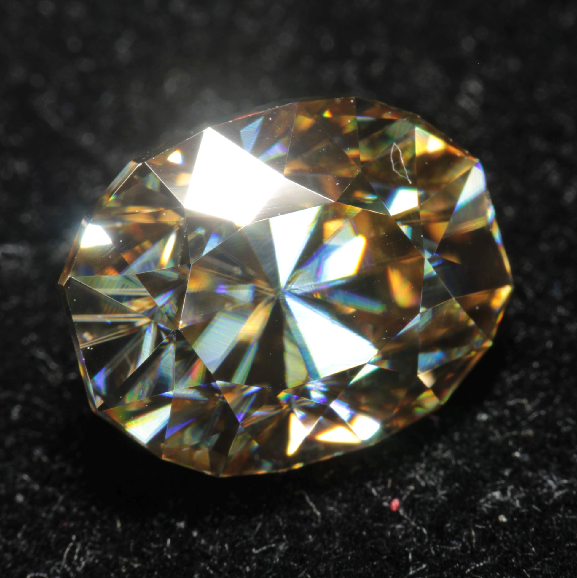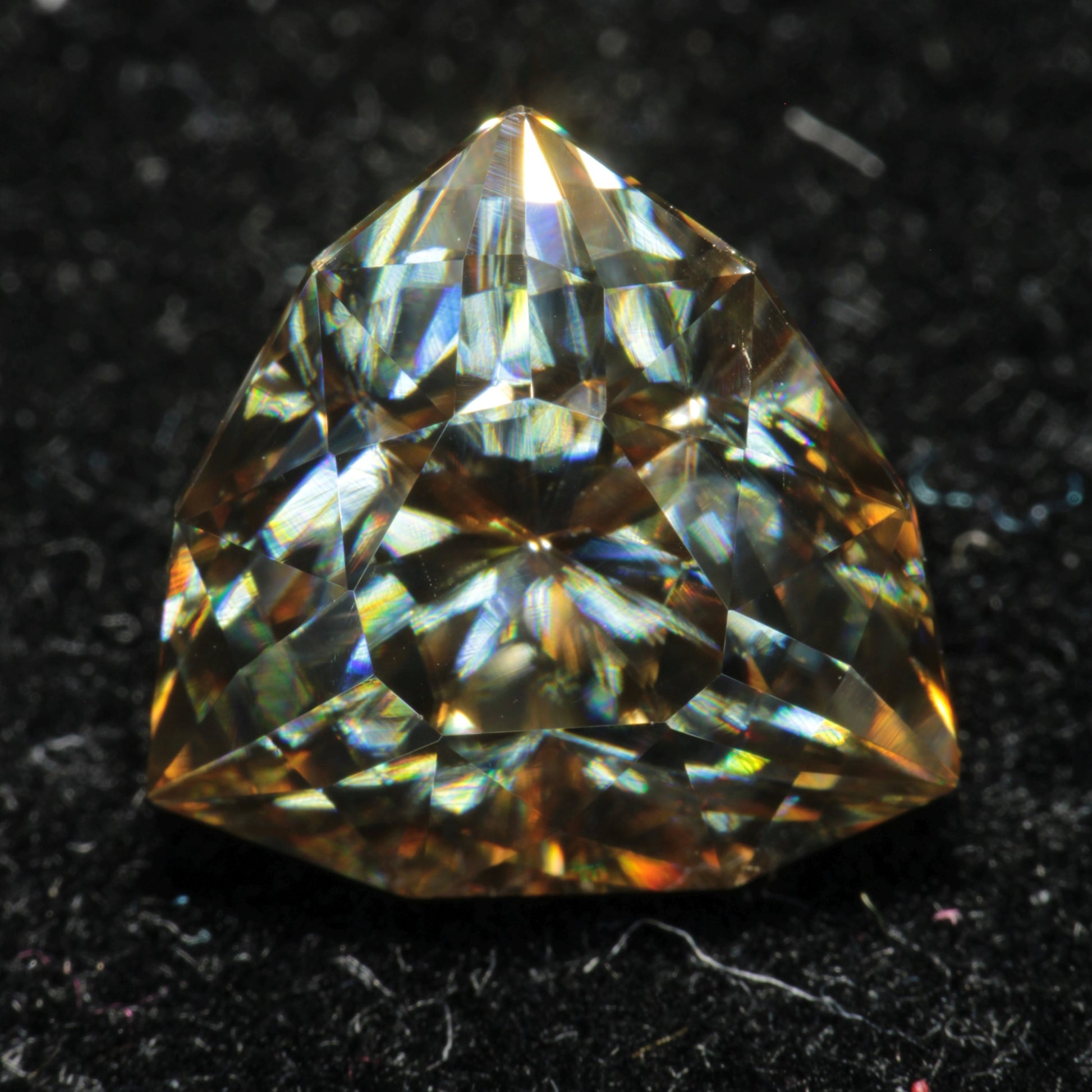 These are faceted smokey golden-grey moissanites with a color very similar to smoky quartz but much greater brilliance and durability.