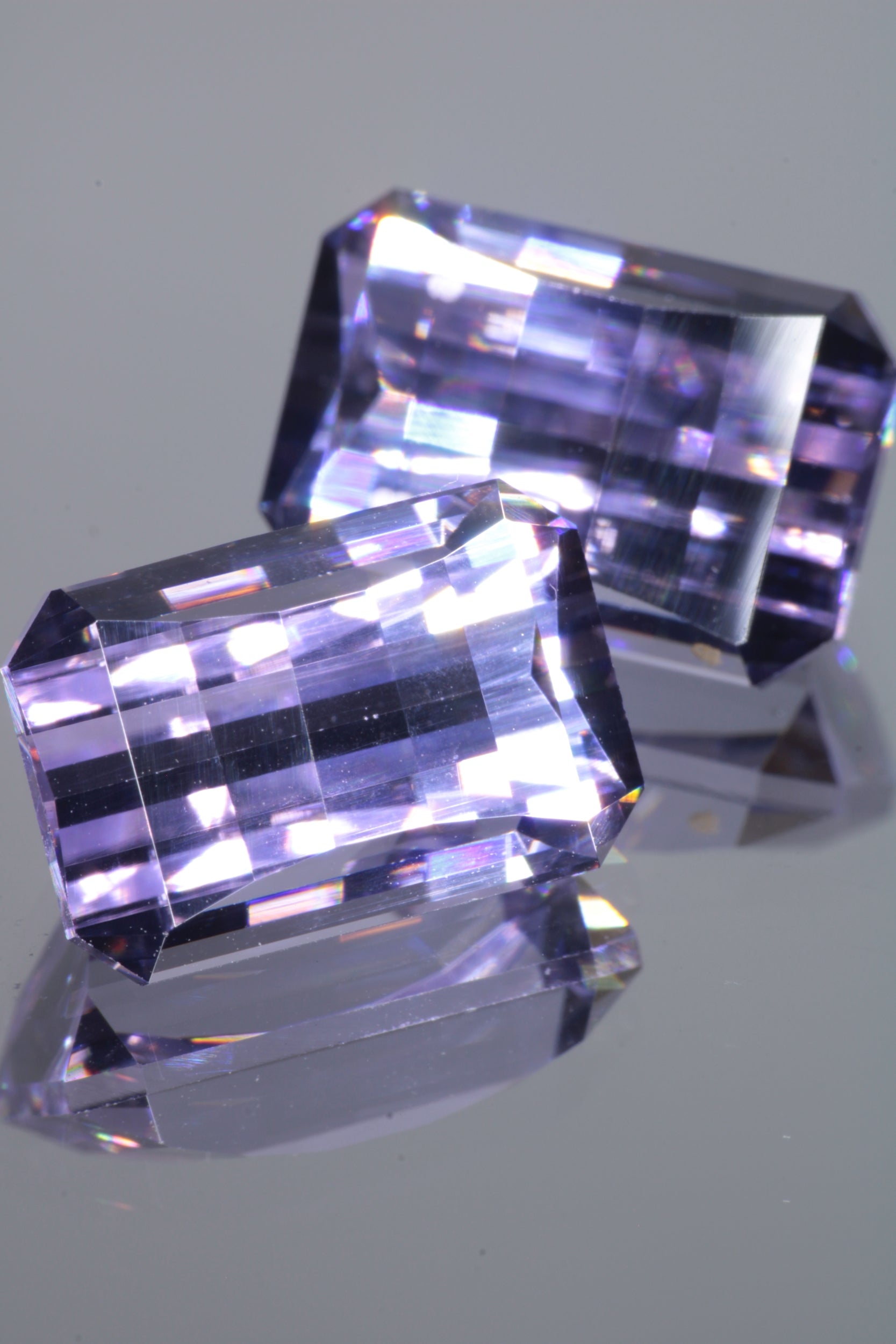 These are violet Nd laser garnets (Nd:YAG) cut in fancy and fantasy cuts. These are violet in normal light and turn pure colorless under fluorescent illumination. Each individual stone is labelled with its carat weight and letter in the photo and they can be purchased individually.