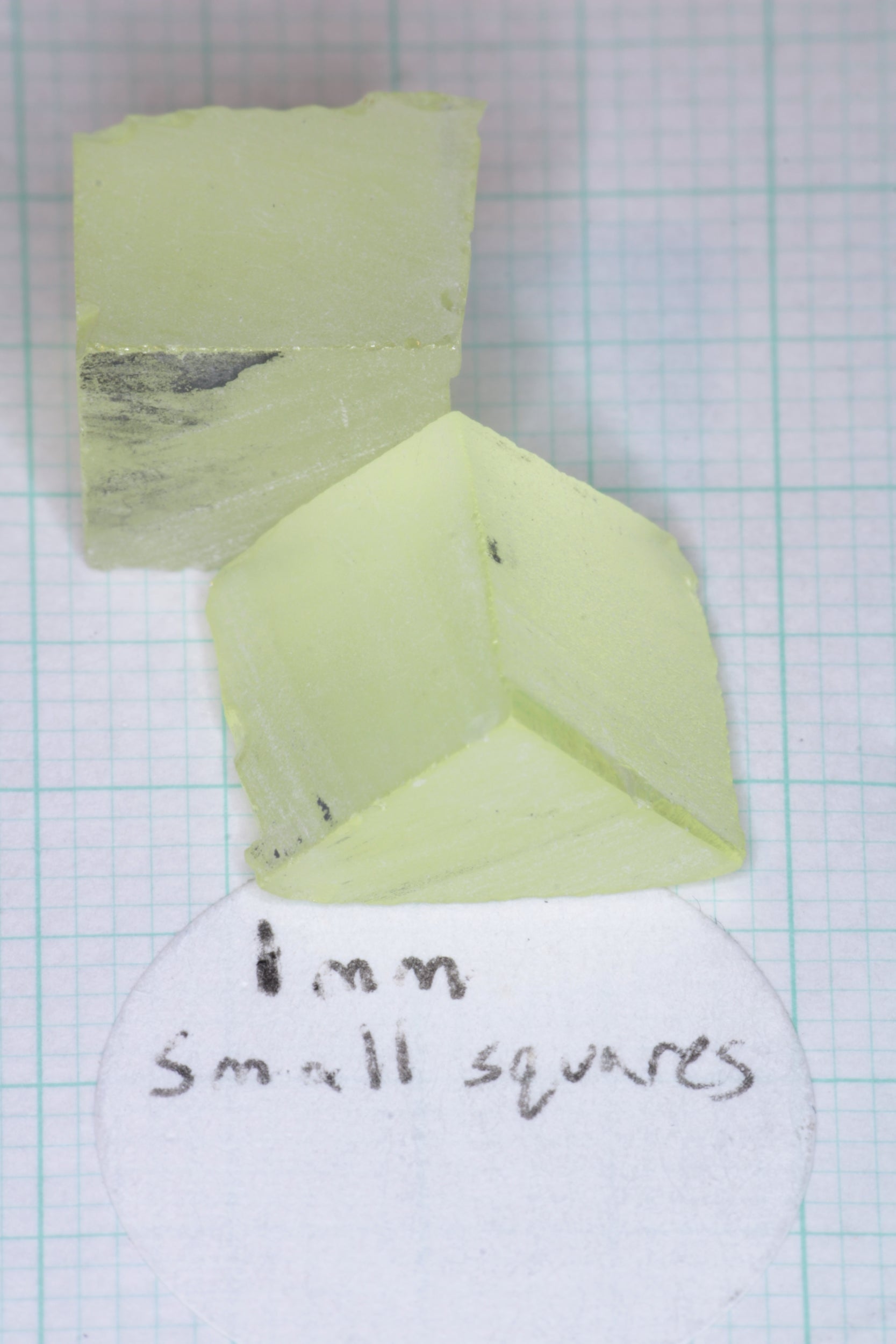 These are lab-created LuAG (Lutetium Aluminum Garnet) facet rough. Each is labelled with its gram weight and letter in the photo and they can be purchased individually.