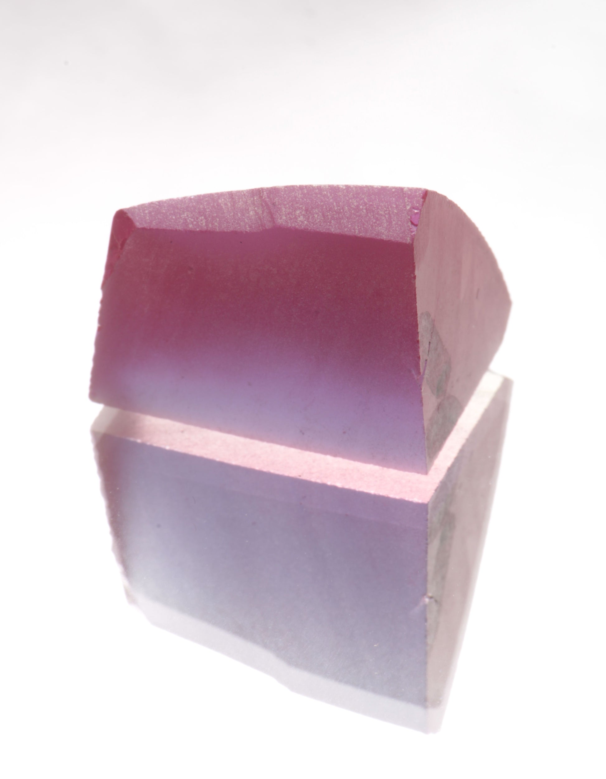 Real synthetic alexandrite has a range of weird properties. It is trichroic, with three different colors visible depending on how the stone is oriented which also change depending on the lighting. These include green, red, purple and blue, and a well cut stone might show flashes of all of them in the right mix of lights. The material we have is also strongly fluorescent with a red glow which adds on top of the other colors. My camera struggles to capture the color change but it is very striking, even changing between direct sunlight and clouded sunlight.