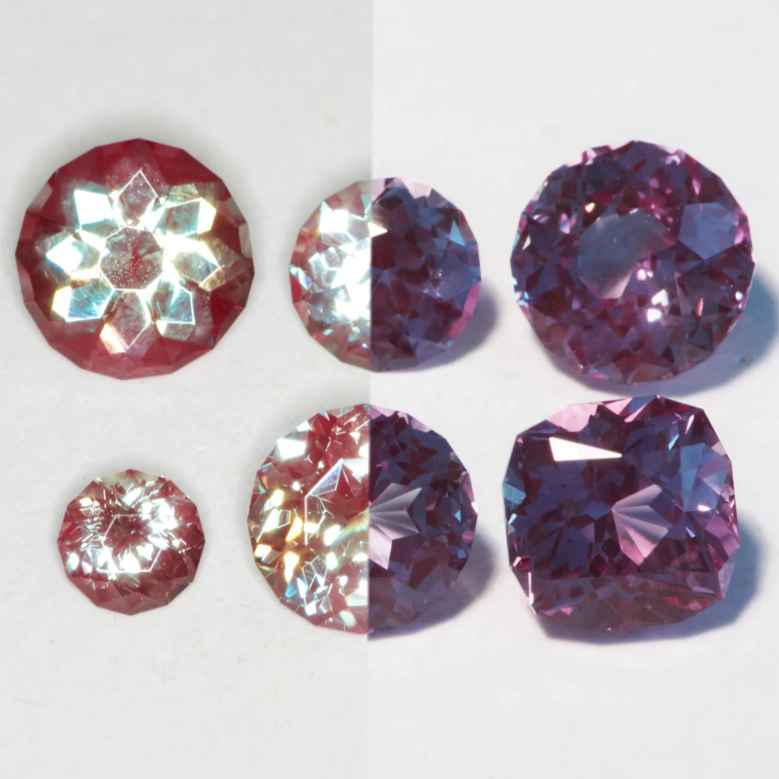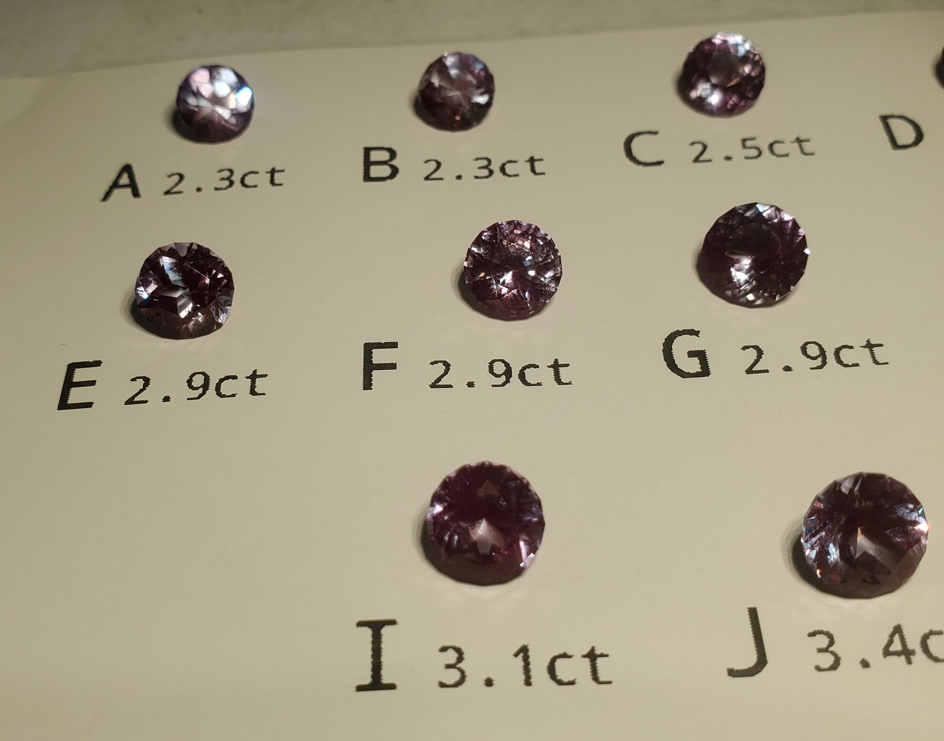 These are genuine, lab-created alexandrite gems faceted from decommissioned laser rods. Each stone is labelled with a letter and weight and can be purchased individually.