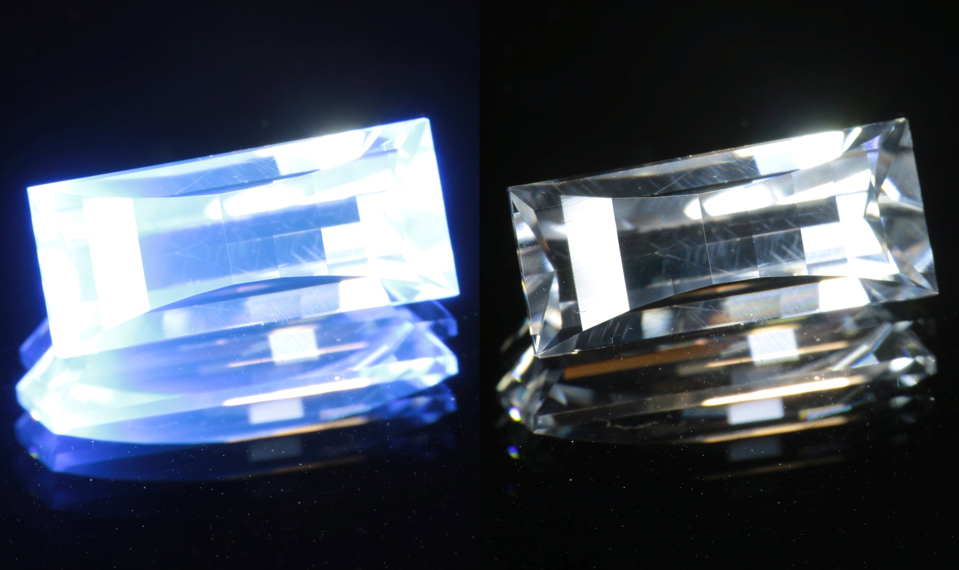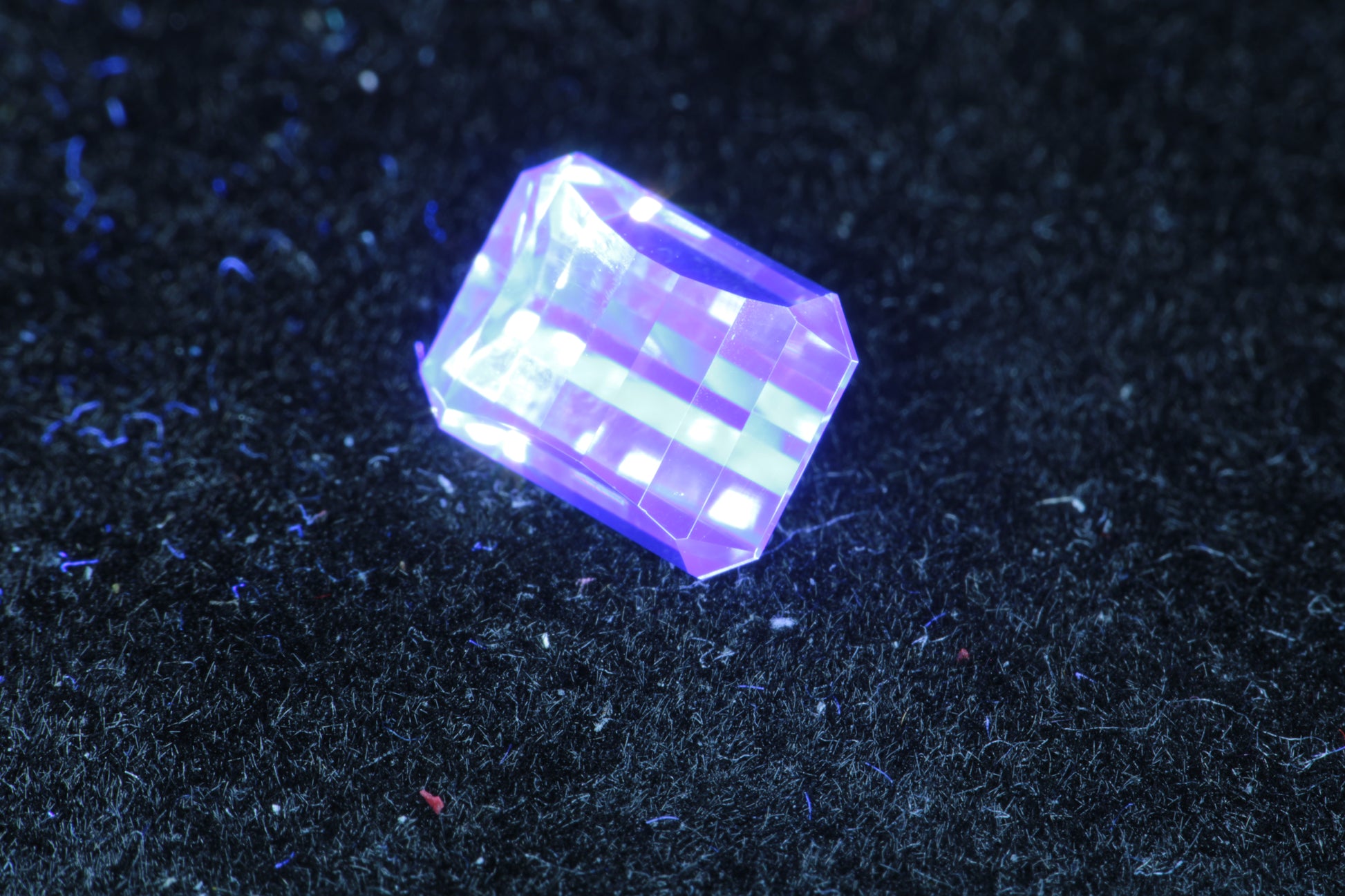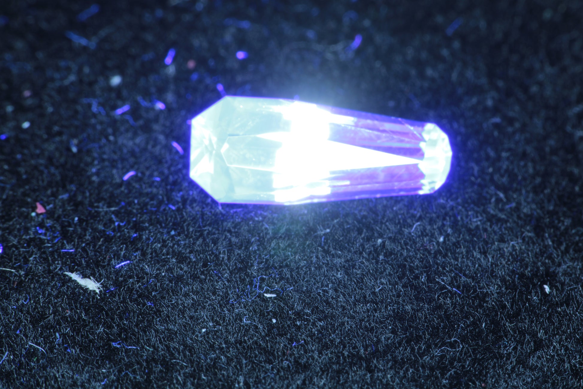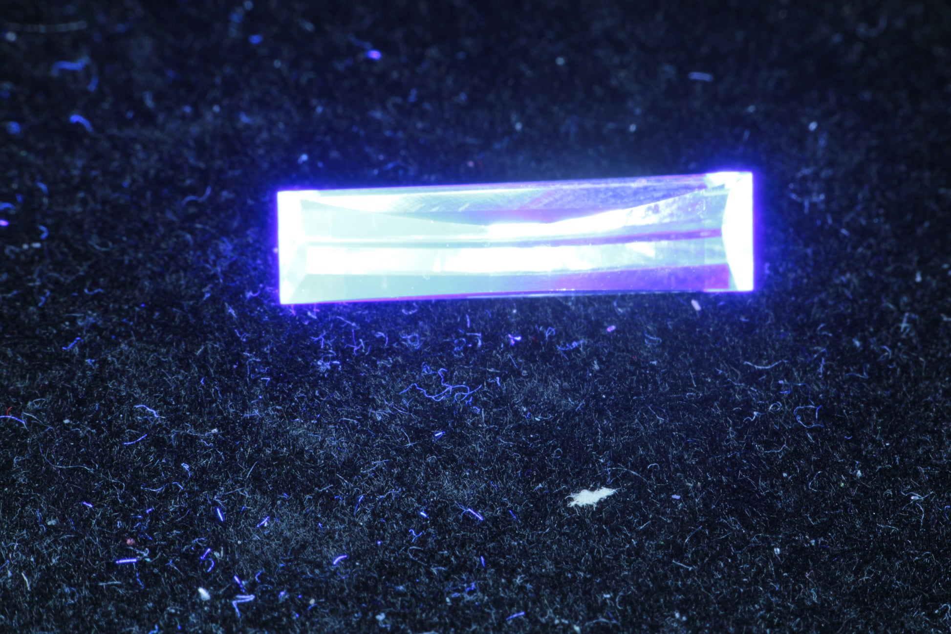 LYSO is a very unusual crystal grown for use in science and industry. It has a clear base and very strong blue fluorescence. It glows incredibly bright under UV light as well as higher energy radiation, and because of this it can be used to detect invisible gamma rays, xrays and even alpha rays. This type of LYSO has been optimized for ultra strong fluorescence with no afterglow (it does not glow in the dark, only with UV exposure). Its fluorescence is so strong it has a striking blue glow in sunlight--this effectively gives it a color change effect, since it looks colorless under room lighting and light purple-blue outdoors. It has a very interesting and unique look which you can't find anywhere else.