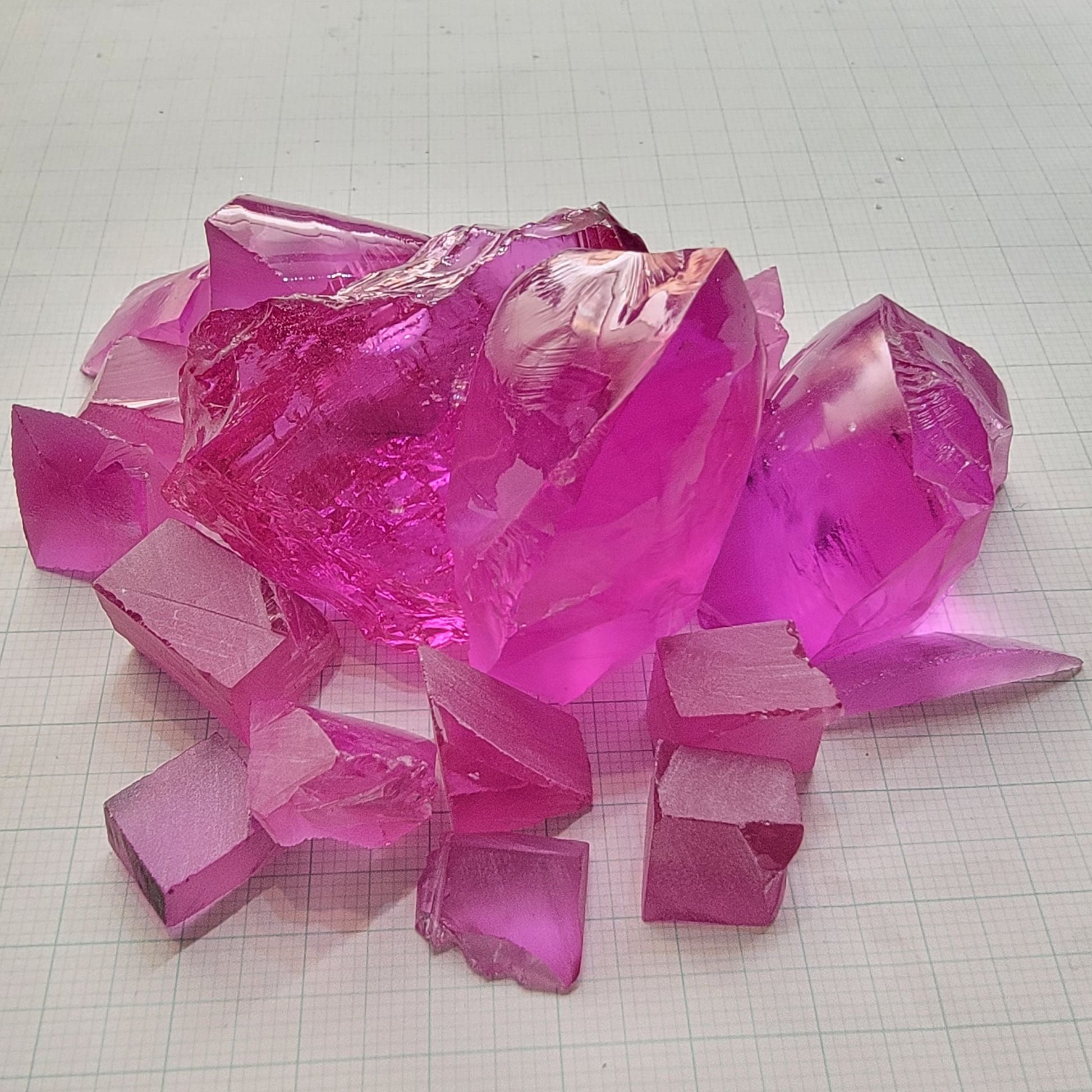 This material cuts super bright, neon pink stones with a ton of scintillation and super bright fluorescence which gives them an extra pop. They are great for any lover of science, fluorescence or the color pink!